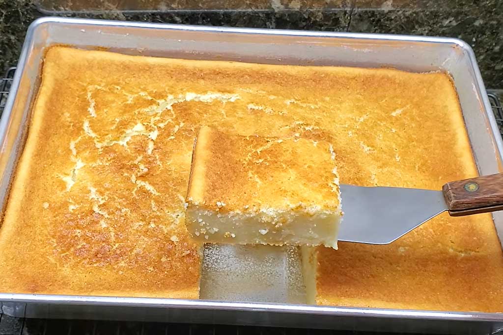 Despeje a massa na forma untada. Ela ficará líquida mesmo, e é assim que deve ser! Asse por 55 minutos. Depois, desligue o forno e deixe a caçarola esfriar lá dentro. Isso ajuda a dar a consistência perfeita.