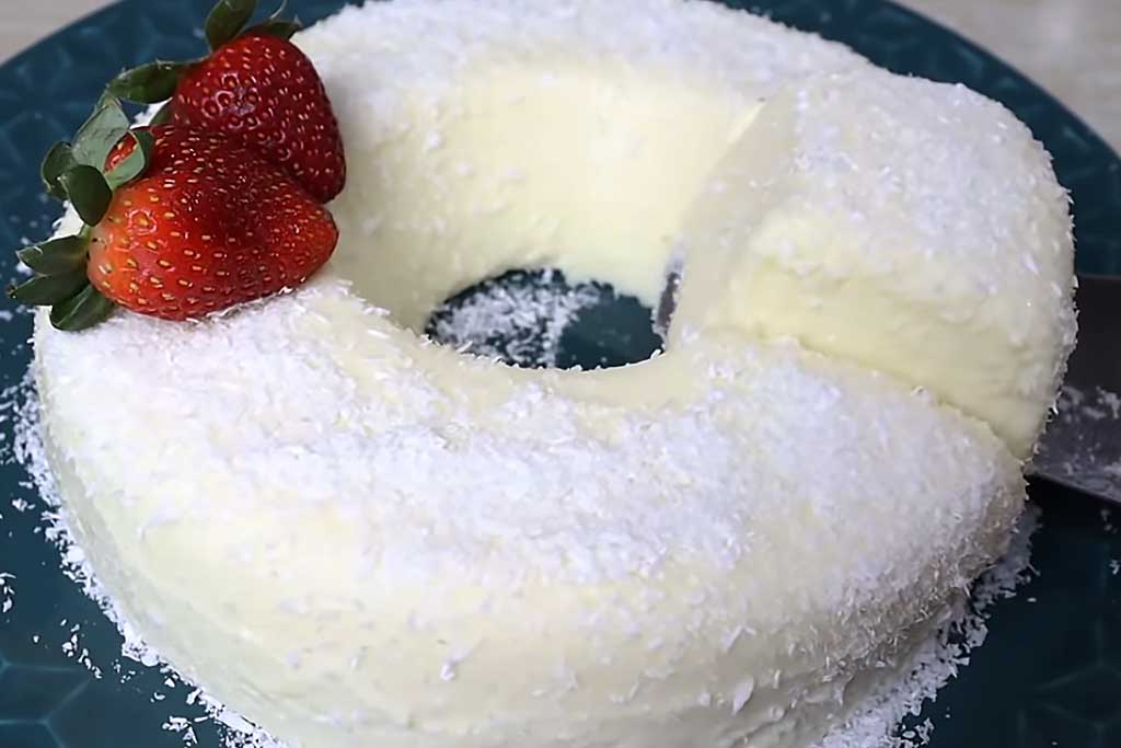 Após gelar, desenforme o pudim e decore com mais coco ralado, conforme sua preferência.