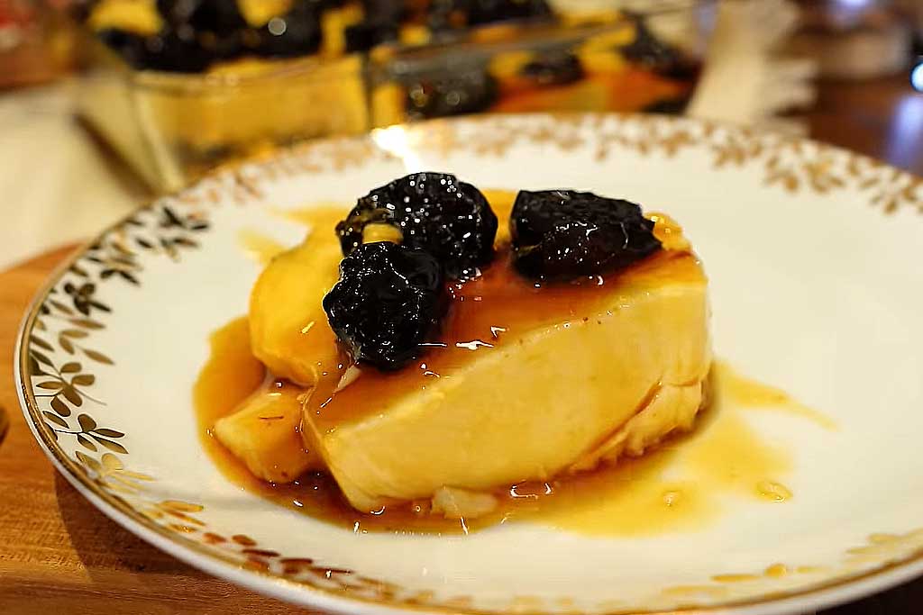 - Retire o manjar da geladeira e espalhe o restante da calda de ameixa por cima.