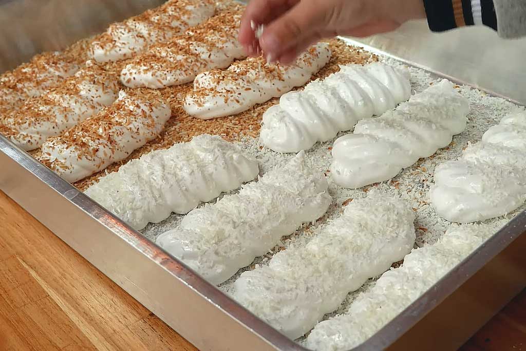 - Para um sabor ainda mais especial, misture coco queimado e coco branco na decoração.