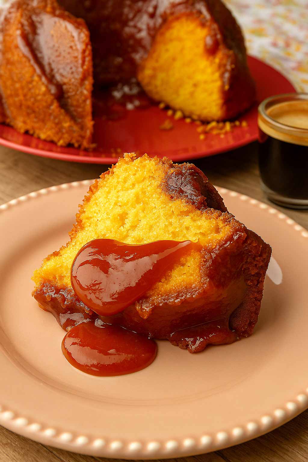 Assim que o bolo estiver assado e levemente frio, desenforme com cuidado. Depois, despeje a calda de goiabada por cima, deixando escorrer pelas laterais...